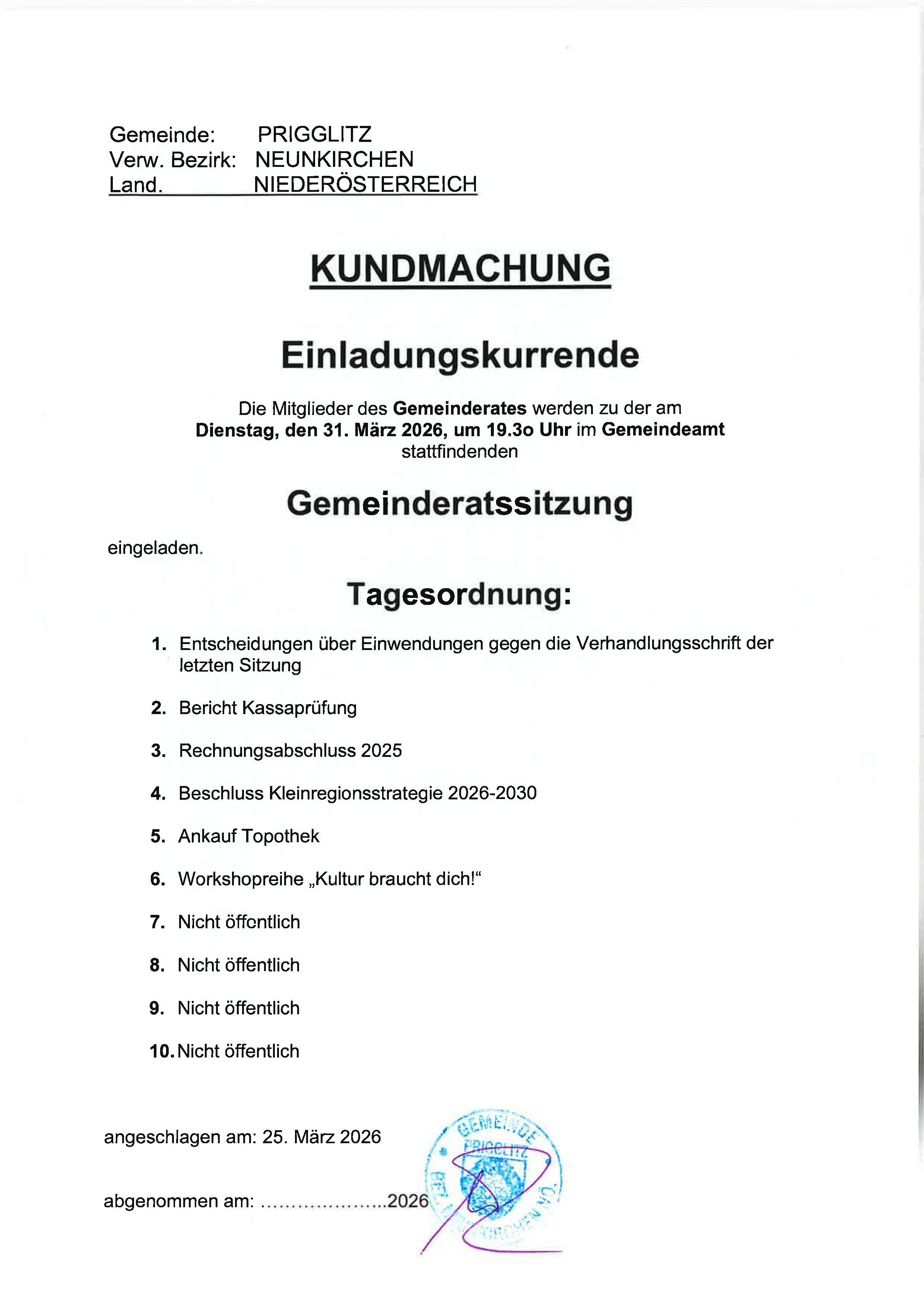 Einladungskurrende Gemeinderatssitzung